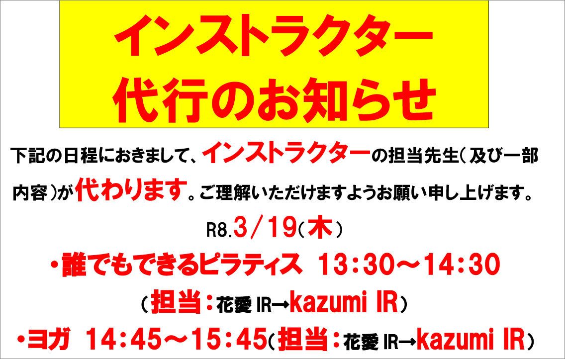 R8.3.19 フィットネス教室インストラクター代行のお知らせ